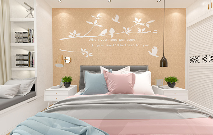 米黄色的卧室背景墙有利于晚上舒缓白天工作的疲 劳,使一整天紧张的工作神经得到放松,帮助人体 进入睡眠。加上硅藻泥墙外表成千上亿孔隙能有效 地削弱高度反射光,使墙面或者整个房间不断坚持 亚光素面状态,可有效缓解久视电视而产生的眼睛 劳累,起到维护视力的作用,所以硅藻泥用途越来 越广。