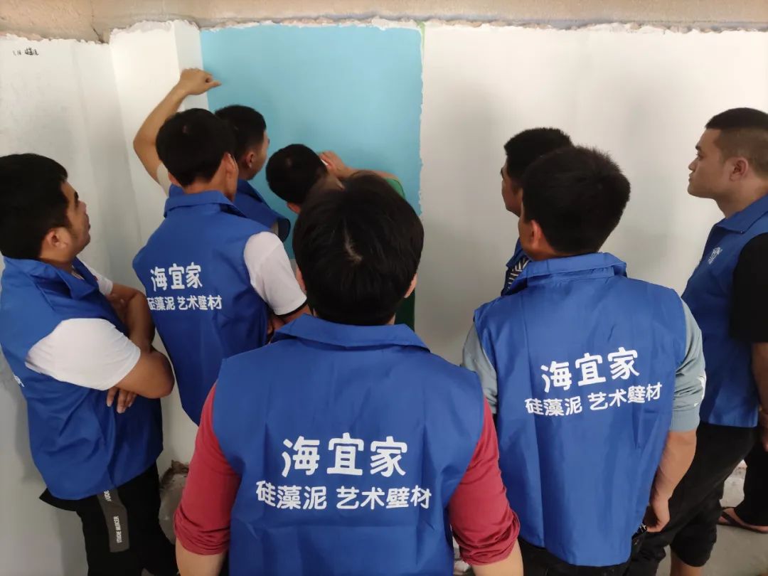 同时,施工培训老师手把手为学员演示、传授施工技巧。包括硅藻泥及艺术壁材的工艺,他们将多年的施工经验和高超的技艺水平将工艺的一些关键点与难点,用通俗易懂的方式淋漓尽致地向学员进行展示与讲解,使学员们通过更简单的方式学会复杂的工艺,让更多的施工师傅掌握更高超娴熟的技艺,让他们真正做到海宜家弘扬的施工文化:比学赶帮,争创一流;相互学习,加强交流,共同提高。
